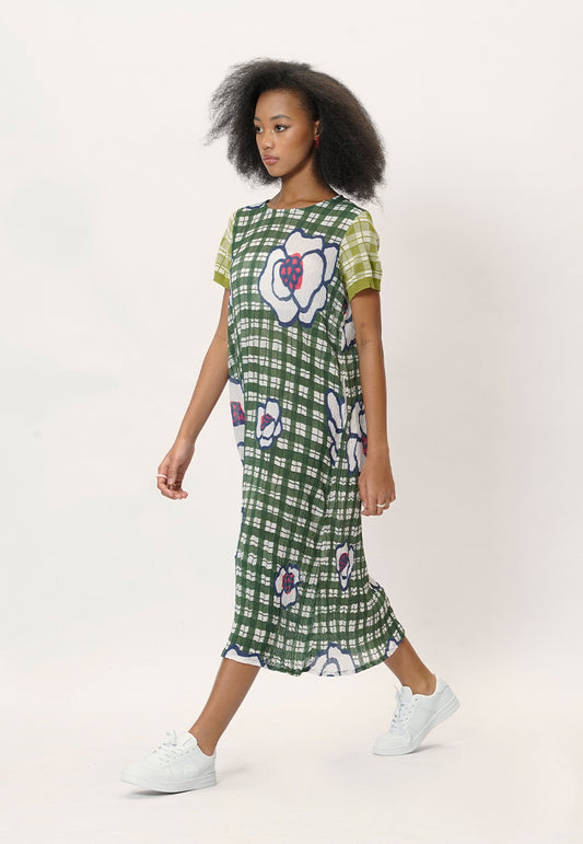 NONA Erica Pleats and Knitted Dress Short Sleeve Kelly Green